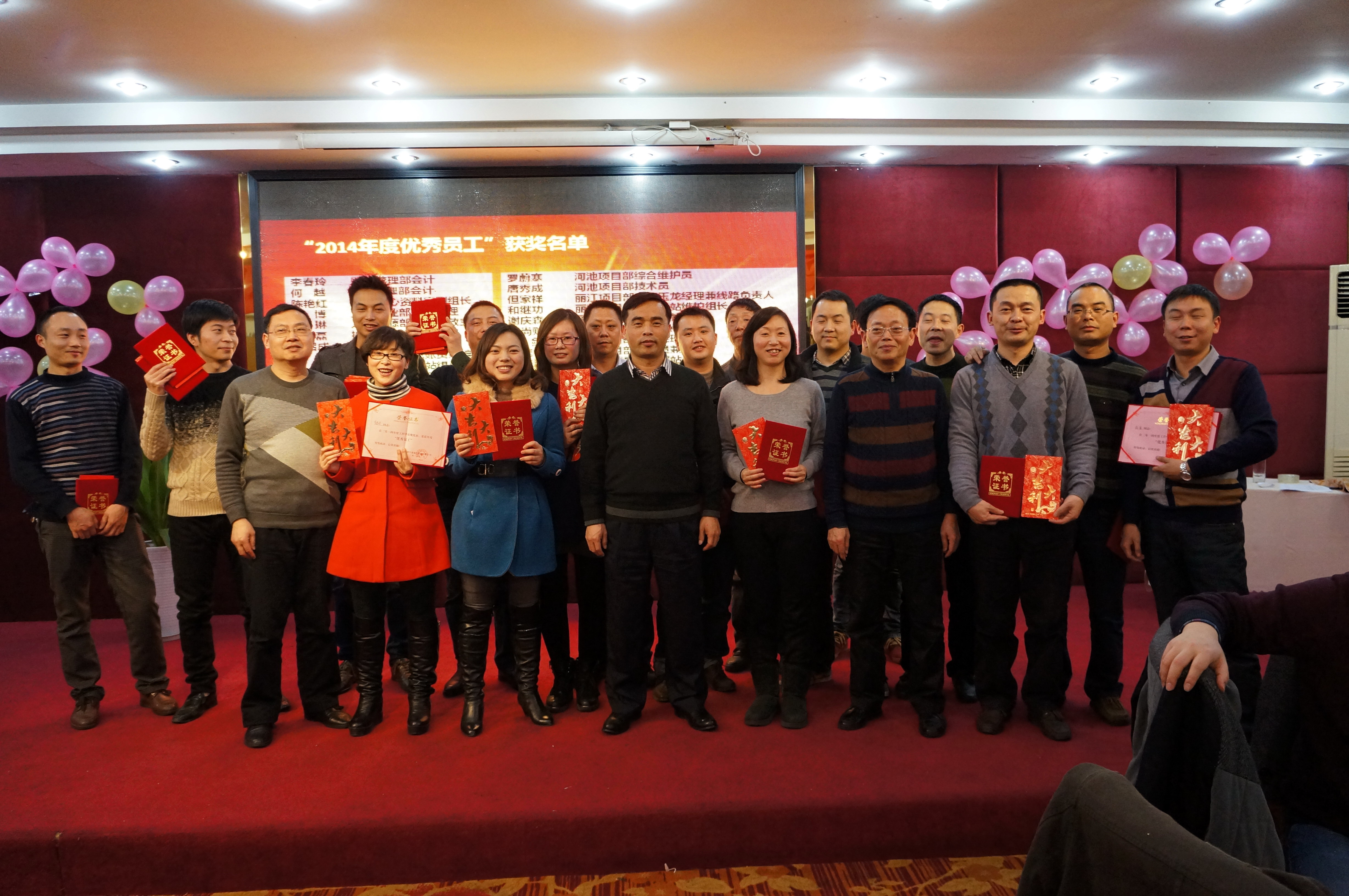(“2015年会晚宴暨颁奖典礼”现场公司领导与2014年度优秀员工合影留念)